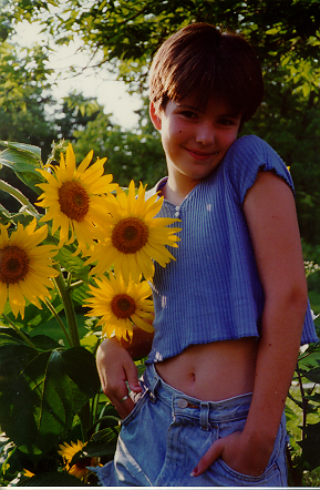 Georgie with the sunflowers in the back garden at Alum Springs Rd. Summer of 1996.