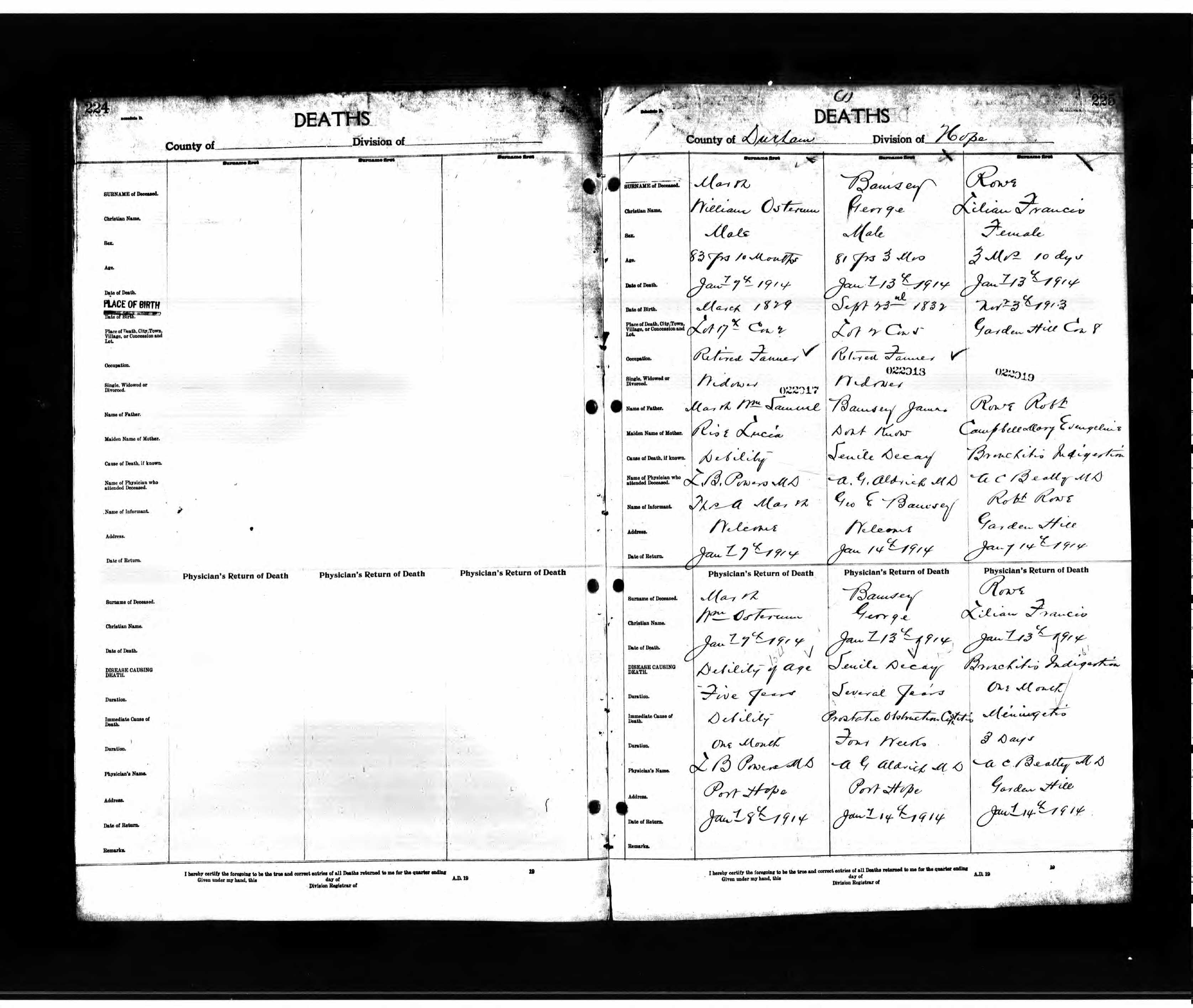 | Died | January 13, 1914 | Hope, Durham County, Ontario, Canada (Death record: George Bamsey, Date of death: January 13, 1914, Date of Birth: September 23, 1832, retired farmer, widower, cause of death: senile decay, informant: George E. Bamsey) (see record) | |