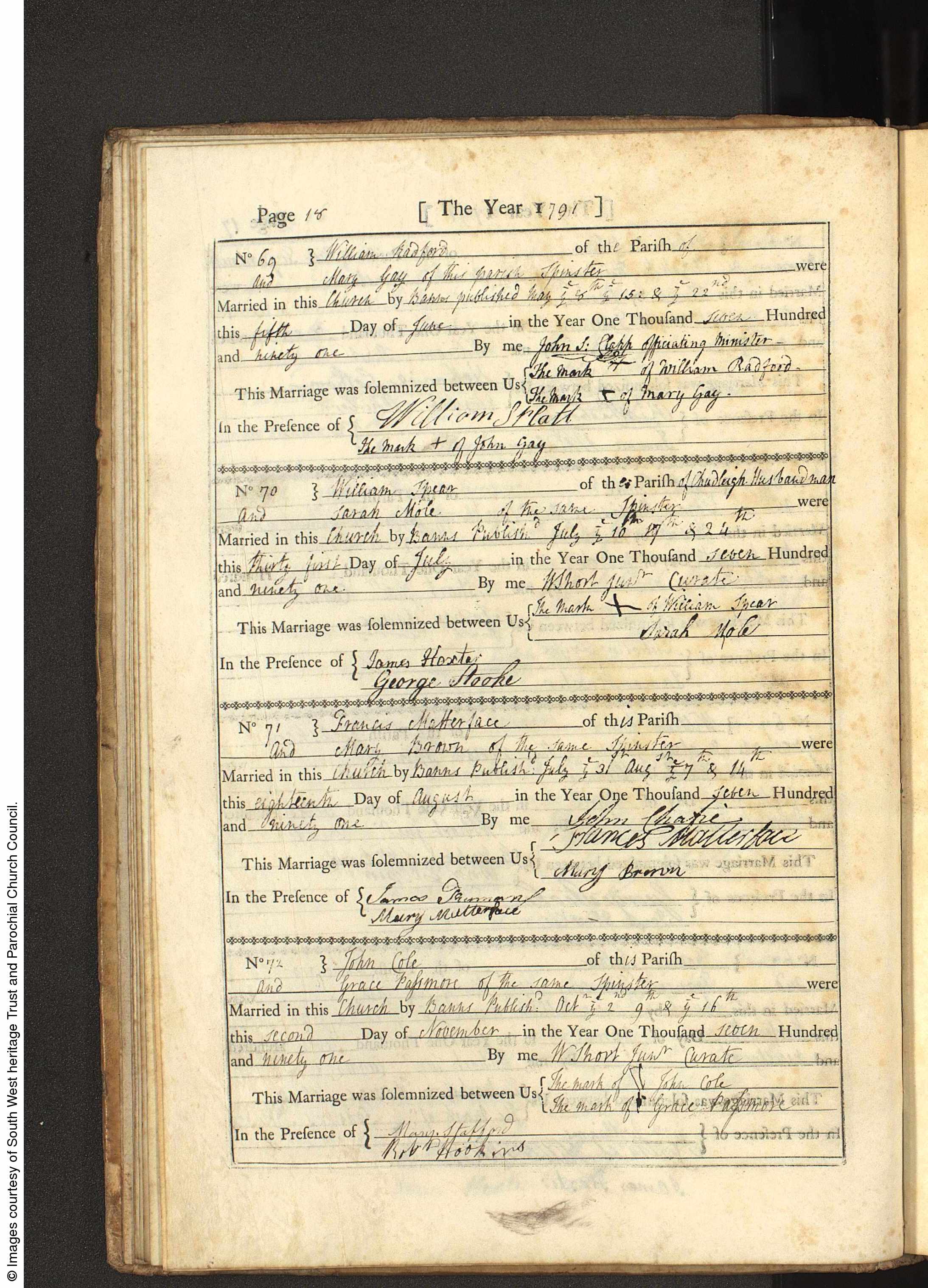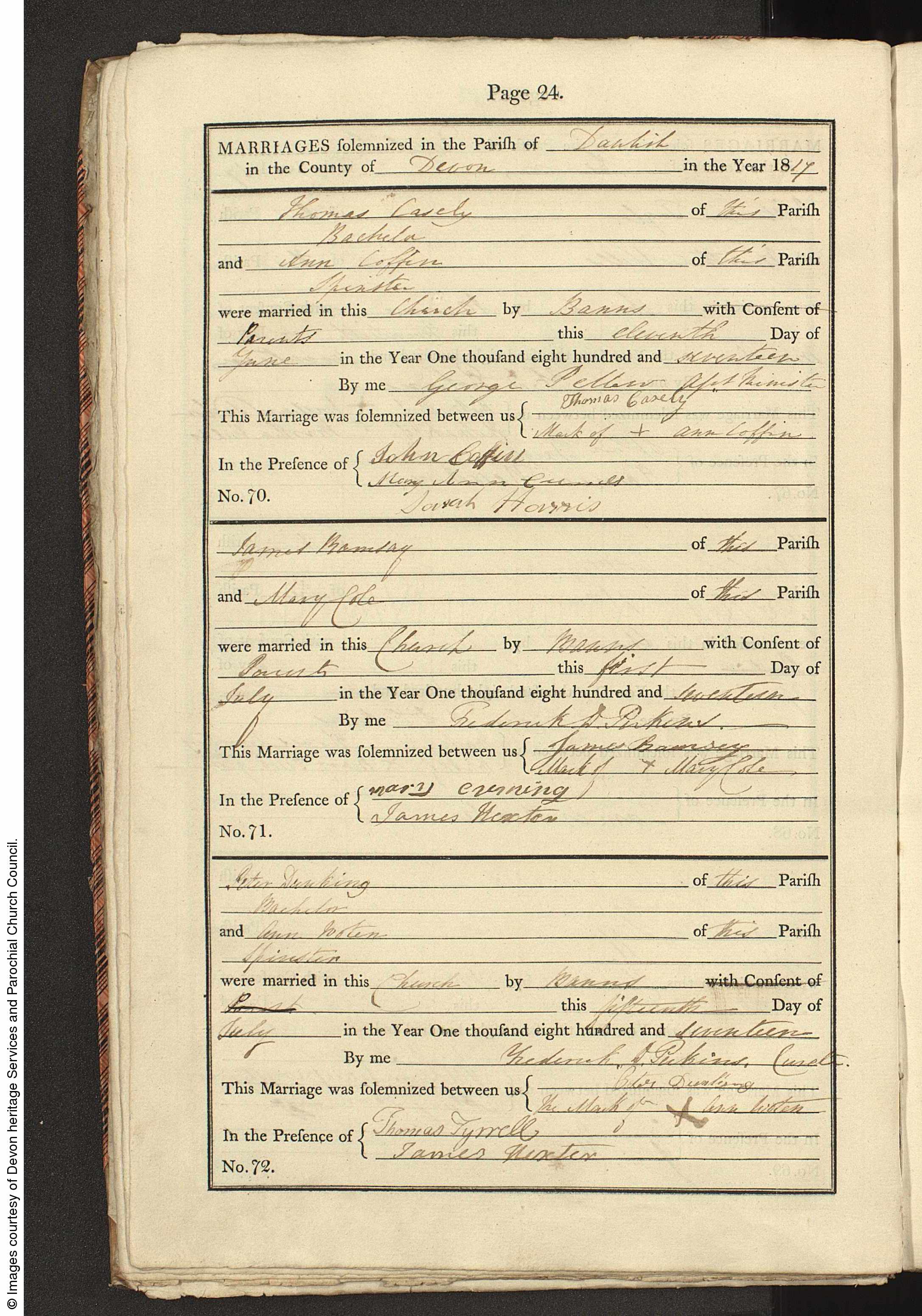 Possible baptism records for Grace: Grace Pasmore, July 19, 1762, Anglican, John and Hannah, Tedburn St Mary; Grace Pasmore, November 17, 1771, Anglican, Richard and Joan, Crediton; Grace Passmore, Baptism date: 28 Jun 1772, Denomination: Anglican, Baptism place: Exeter, St Mary Steps, Father's first name: William, Mother's first name: Elizabeth. Probable baptism record for John: John Cole, Birth date: 7 Apr 1771, Baptism date: 1 May 1771, Denomination: Anglican, Baptism place: Dawlish, St Gregory the Great, Father's first name: John, Mother's first name: Elizabeth. Probable siblings in John Cole's family (all born to John and Elizabeth Cole in Dawlish, baptised at St. Gregory's): Elizabeth b. 22 Sep 1766 (bapt. 12 Oct 1766) Giles b. 12 Jun 1769 (bapt. 2 Jul 1769) John b. 7 Apr 1771 (bapt. 1 May 1771) George b. 27 Jan 1773 (bapt. 14 Feb 1773) Sarah b. 28 Feb 1775 (bapt. 19 Mar 1775) Anne b. 7 Feb 1777 (bapt. 26 Feb 1777) William b. 5 Feb 1779 (bapt. 21 Feb 1779) Nehemiah b. 7 Jun 1781 (bapt. 24 Jun 1781) Charles b. 4 Mar 1783 (bapt. 23 Mar 1783) Nicholas b. 17 Nov 1784 (bapt. 12 Dec 1784) John Cole and Elizabeth Gale married in Dawlish, Marriage date: 17 Feb 1765. | ||