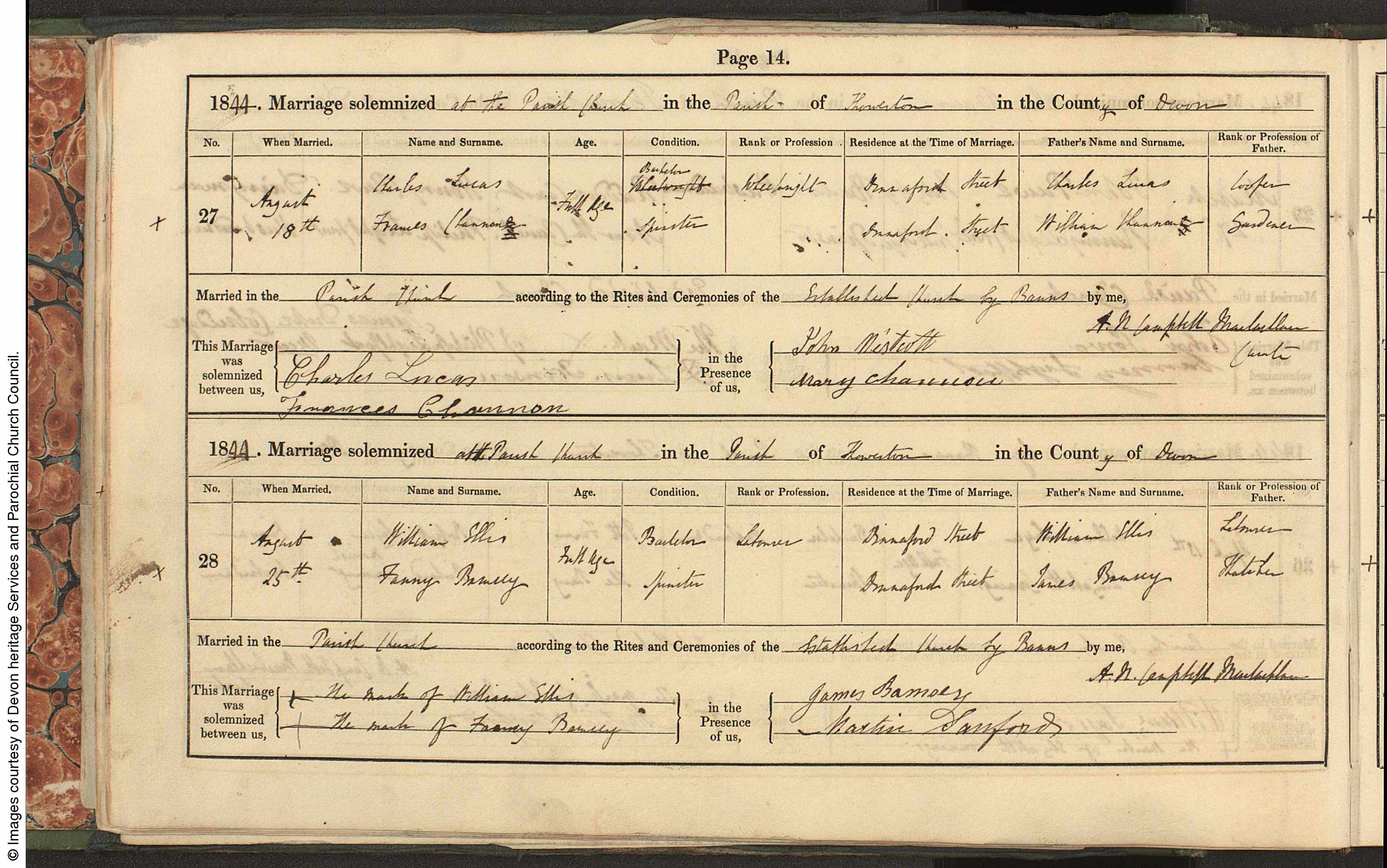| Married | Church marriage record, Parish of Thorverton, Devon: August 25, 1844, William Ellis, labourer, and Fanny Bamsey, both residing at Dinneford Street, Thorverton, parents, William Ellis, labourer, and James Bamsey, thatcher. William and Fanny signed with a mark, the witnesses were James Bamsey and Martin Sanford (see record). Note that Frances Ellis is given two pounds by her father's will of February 12, 1872. | ||