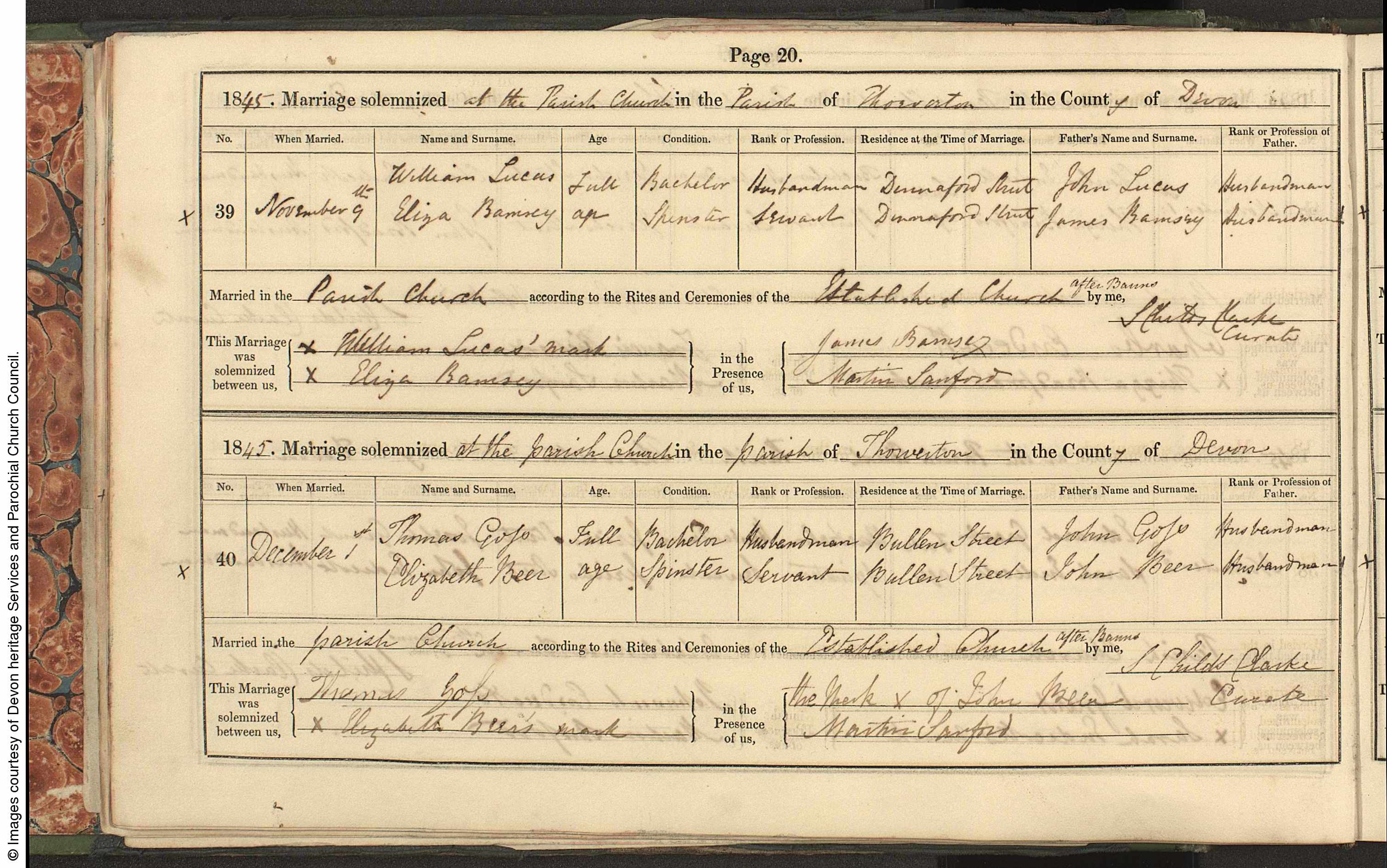 | Married | November 9, 1845 | Church record, Parish of Thorverton, Devon, November 9, 1845, William Lucas, husbandman, and Eliza Bamsey, servant, both residing at Dinneford Street, Thorverton, parents, John Lucas, husbandman, and James Bamsey, husbandman. Eliza and William signed with a mark. Witnesses were James Bamsey and Martin Sanford (see record). Note that Eliza Lucas is given two pounds by her father's will of February 12, 1872. | |