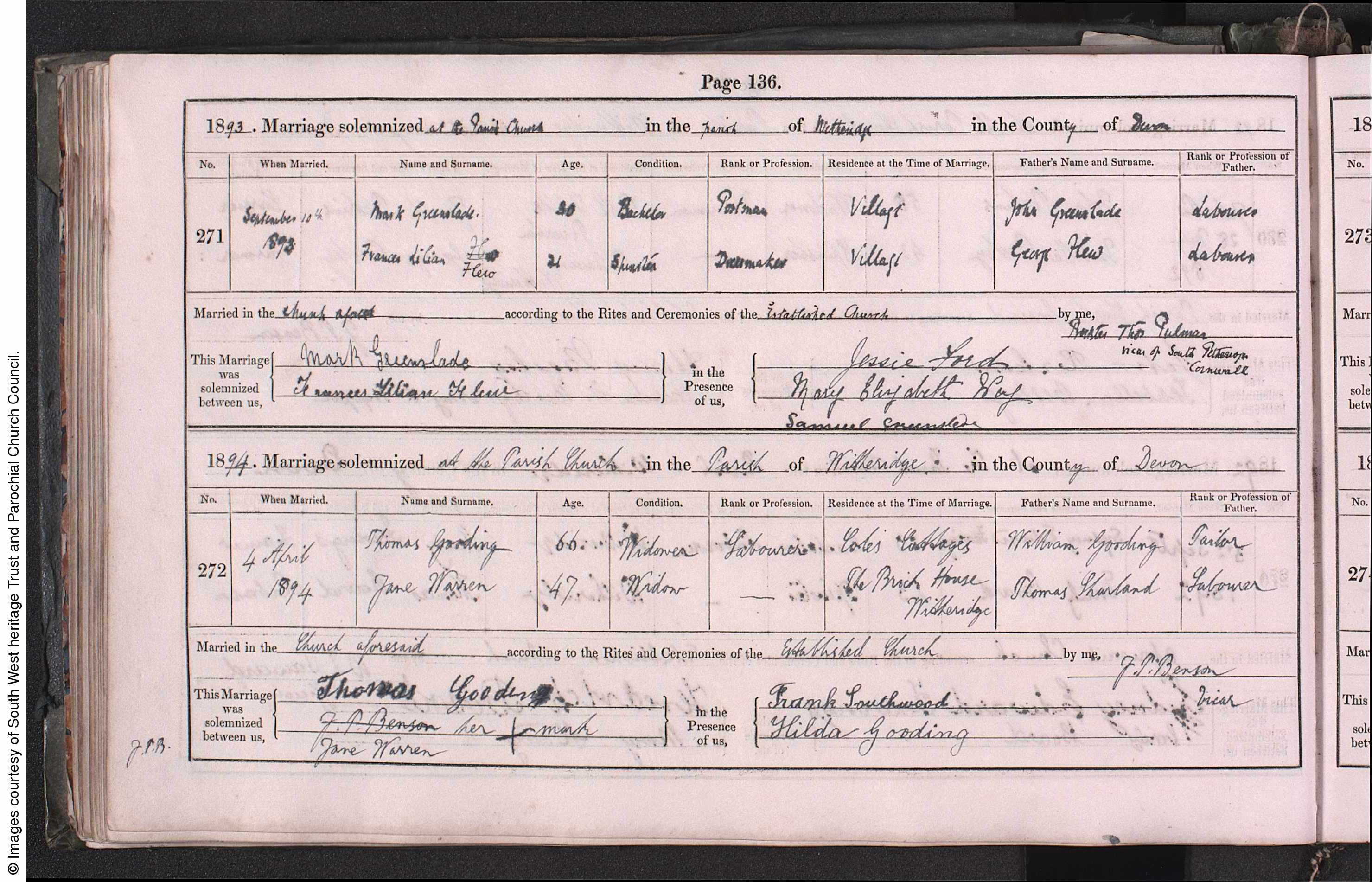 | Married | September 10, 1893 | Witheridge, Devon (Mark Greenslade, Marriage date: 10 Sep 1893, Age: 30, Profession: Postman, Residence: Village, Place: Witheridge, Father's name: John Greenslade, Spouse's name: Frances Lilian Flew, Spouse's residence, Witheridge, Spouse age: 26, Profession: Dressmaker, Spouse's father's name: George Flew)[As well as the other 2 witnesses, Samuel Greenslade also signed the marriage record](see record) | |