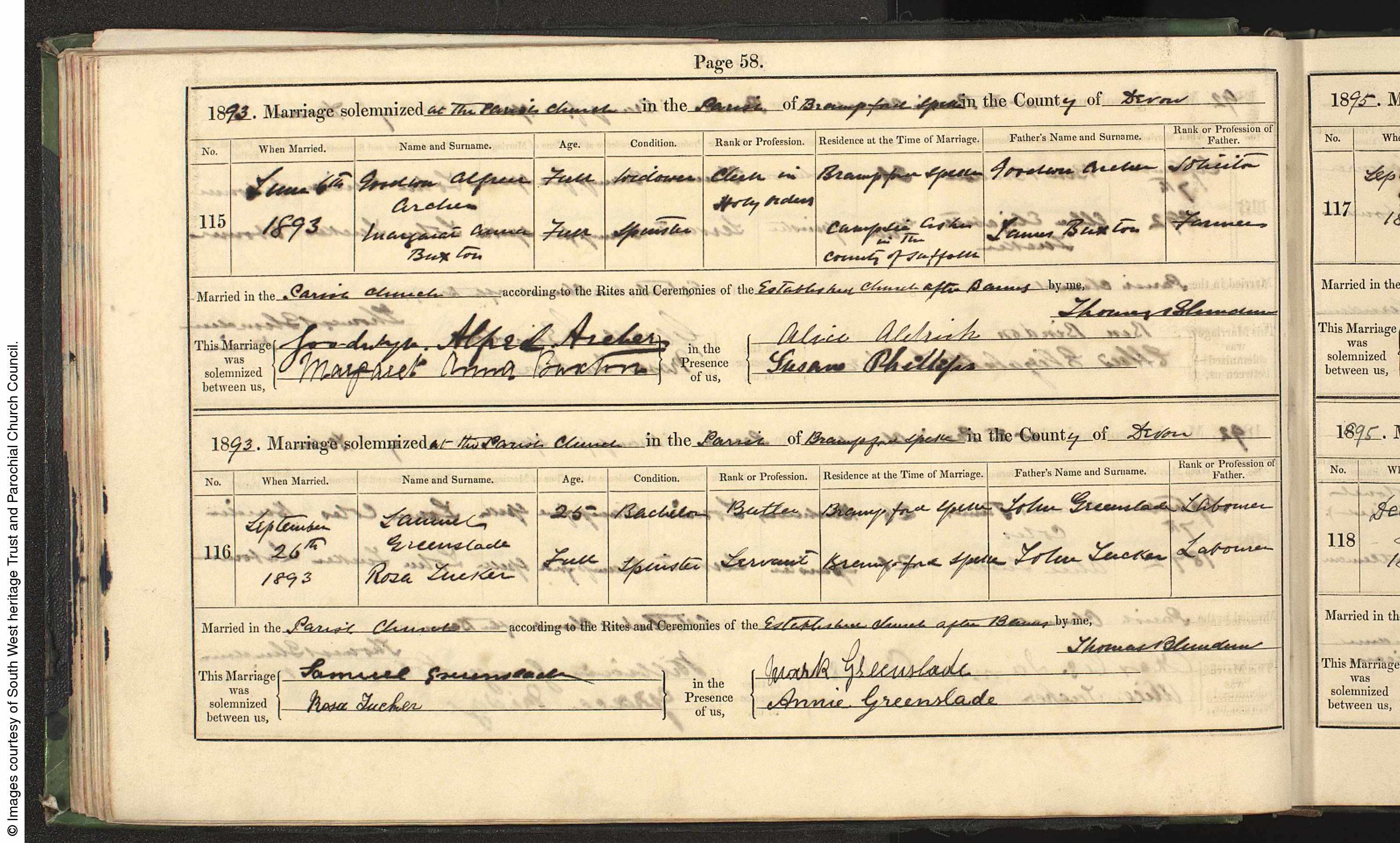 | Married | September 26, 1893 | Brampford Speke, Devon (Samuel Greenslade, Marriage date: 26 Sep 1893, Father's name: John Greenslade, Spouse's name: Rosa Tucker, Spouse's father's name: John Tucker, Witnesses: Mark Greenslade and Annie Greenslade)(see record) | |