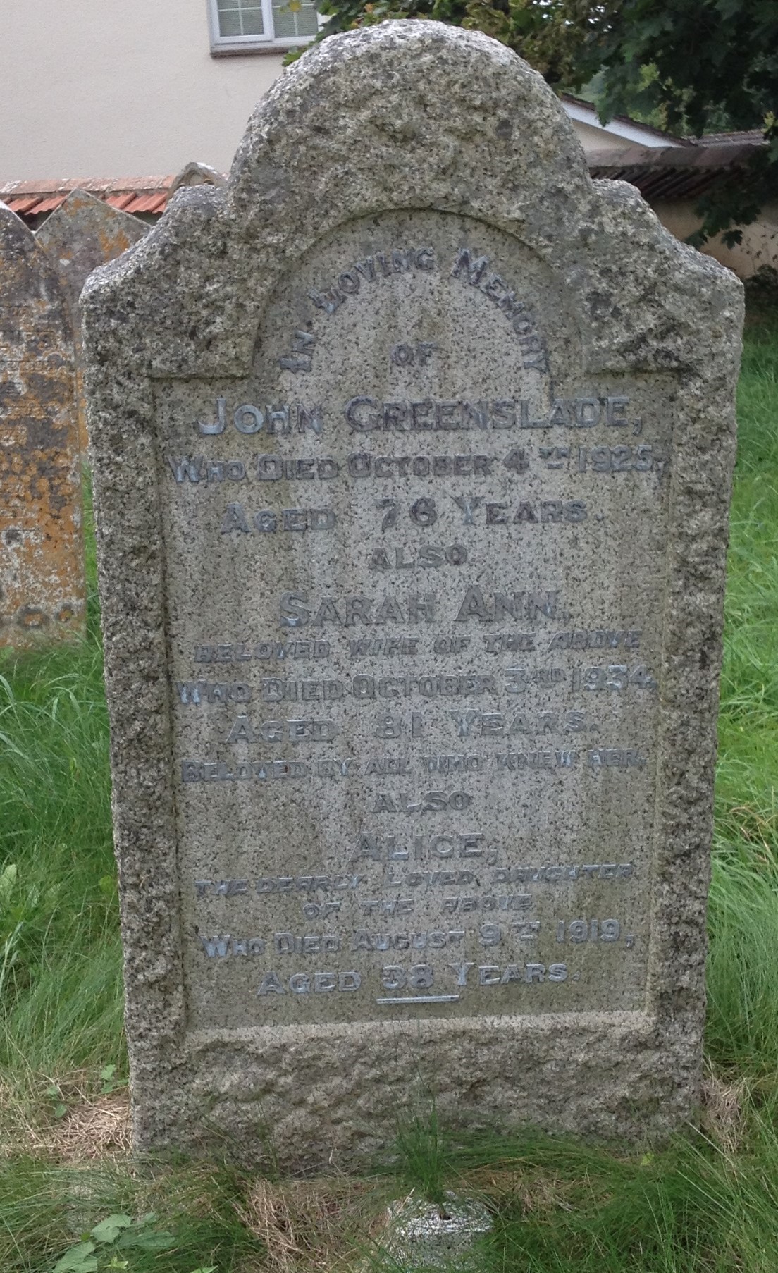 There is an extensive obituary of John's wife, Sarah Ann, in the newspaper, Western Times (Friday, October 12, 1934) 'The funeral took place in Cheriton Fitzpaine Churchyard, on Sunday [October 7, 1934], of one of its oldest and most highly esteemed residents, Mrs. Sarah Ann Greenslade, whose death at the advanced age of 81 years occurred at her residence, "Bowdell," Cheriton, after a short illness. There was a large number of sympathisers present. Although born at Bunleigh, North Tawton, deceased came to live in the village at the age of 18 years, and a year later married Mr. John Greenslade the village carrier to Exeter, and became the mother of eleven children--seven sons and four daughters. They lost one daughter by death, and the remaining ten children were present at the funeral. Her husband pre-deceased her on a day earlier in the same month nine years ago. Deceased was devoted to her home and family, and had a pleasant word for all, with a ready sympathy wherever help was required. She was affectionately known as "Granny" Greenslade chiefly on account of her interest in the children.... The family mourners were Mr. William E. Greenslade, Exeter (son), Mrs. A. Heywood (daughter), Mr. John Greenslade, Shobrooke (son), Miss Ellen Greenslade (daughter), Mr. George Greenslade (son), Mrs. Homeyard, Creedy Bridge (daughter), Mr. Charles Greenslade (son), Mrs. L. Greenslade, Exeter (sister-in-law), Mrs. Dunn (sister-in-law), Mr. Mark Greenslade (son), Mrs. J. Greenslade (daughter-in-law), Mr. Fred Greenslade, Shobrooke (son), Mrs. C. Greenslade (daughter-in-law), Mr. Sam Greenslade (son), Mrs. M. Greenslade (daughter-in-law), Mr. J. Homeyard (son-in-law), Mrs. F. Greenslade (daughter-in-law), Mrs. S. Greenslade, Exeter (sister-in-law), Mrs. S. Greenslade (daughter-in-law), Mr. Mark Greenslade (brother-in-law), Mrs. G. Greenslade (daughter-in-law), Messrs E. Greenslade (Newton St. Cyres) S. Gillard (Tiverton), J. and E. Gillard (Bampton), nephews; Mrs. Prior (Exeter), Misses Winnie and Edith Greenslade (Shobrooke), Miss Dorothy Greenslade (Sandford), Freddie, Rene, Joyce and Betty Greenslade (Shobrooke), grandchildren; and Peggy Greenslade (Cheriton), Mr. T. Oliver, and Miss Toomer (Exeter). ...' | ||