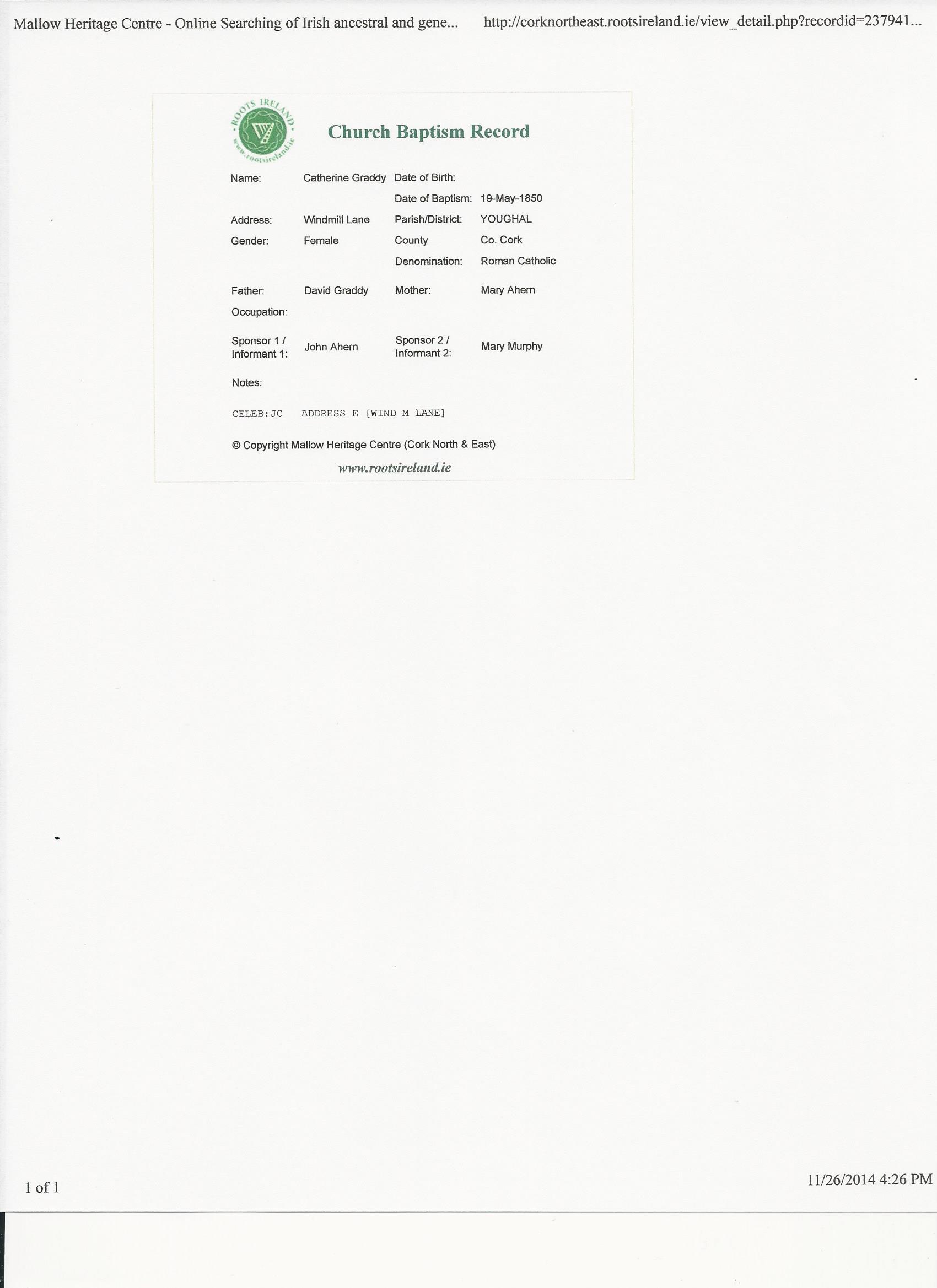 | Baptised | May 19, 1850 | Youghal (Catherine Graddy, Date of Baptism: 19-May-1850, Address: Windmill Lane, Parish: Youghal, Father: David Graddy, Mother: Mary Ahern, Sponsors: John Ahern and Mary Murphy. See record)) |
