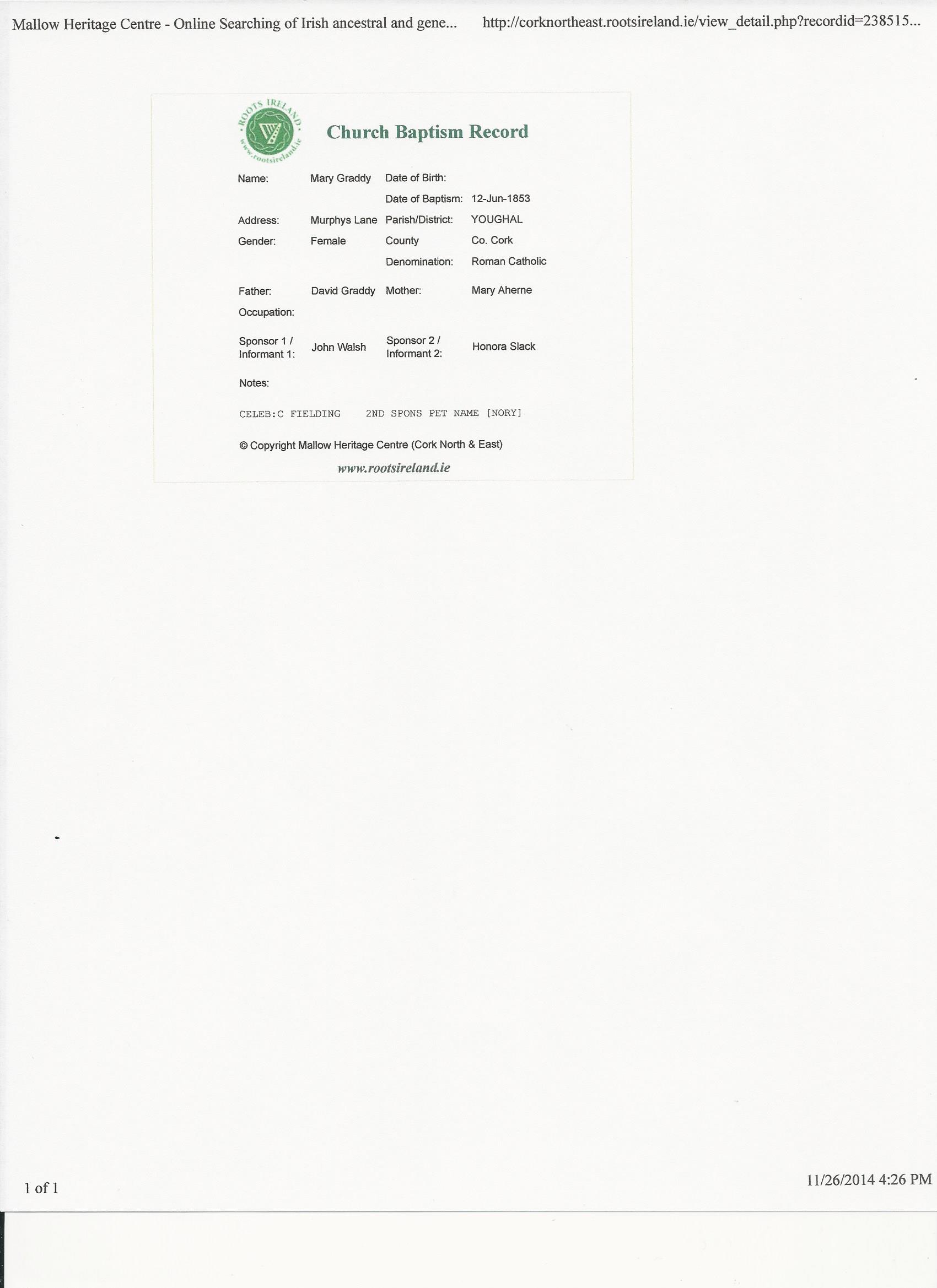 | Baptised | June 12, 1853 | Youghal (Mary Graddy, Date of Baptism: 12-Jun-1853, Address: Murphys Lane, Parish: Youghal, Father: David Graddy, Mother: Mary Aherne, Sponsors: John Walsh and Honora Slack. See record)) |