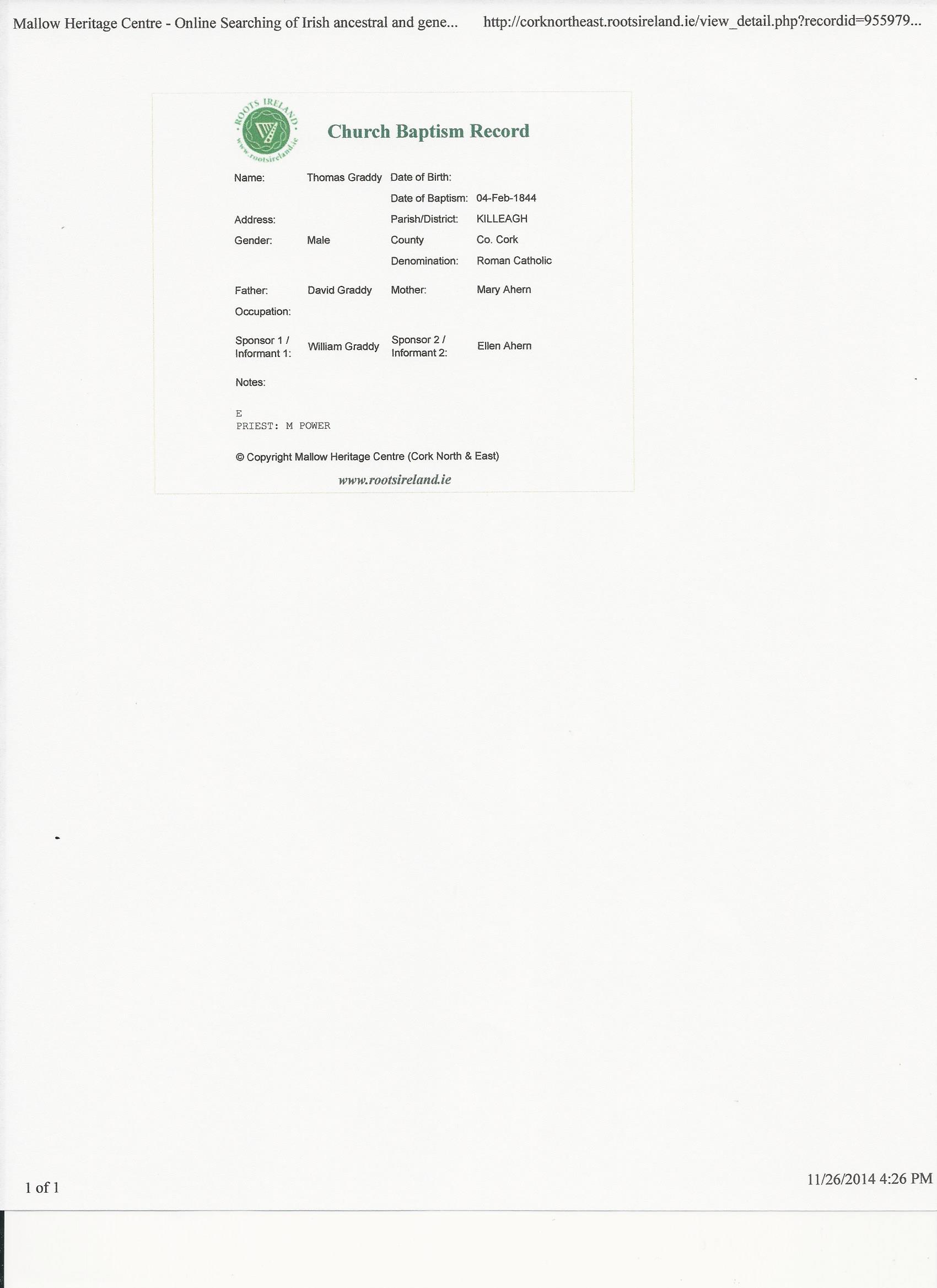 | Baptised | February 4, 1844 | Killeagh (Thomas Graddy, Date of Baptism: 04-Feb-1844, Parish: Killeagh, Father: David Graddy, Mother: Mary Ahern, Sponsors: William Graddy and Ellen Ahern. See record)) |