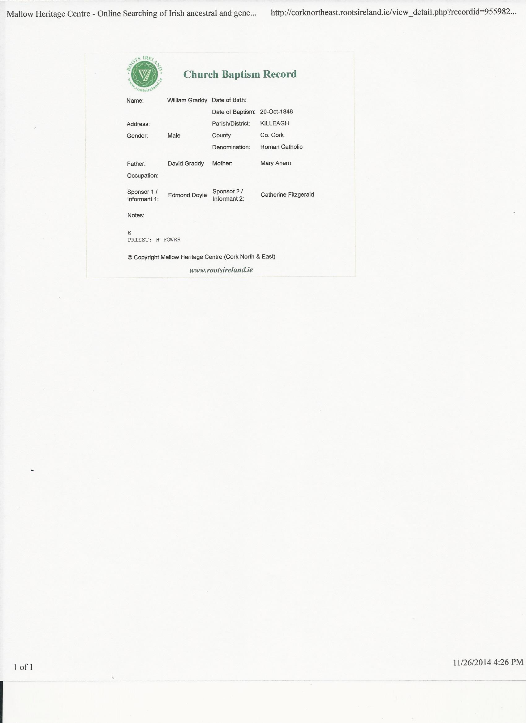 | Baptised | October 20, 1846 | Killeagh (William Graddy, Date of Baptism: 20-Oct-1846, Parish: Killeagh, Father: David Graddy, Mother: Mary Ahern, Sponsors: Edmond Doyle and Catherine Fitzgerald. See record)) |