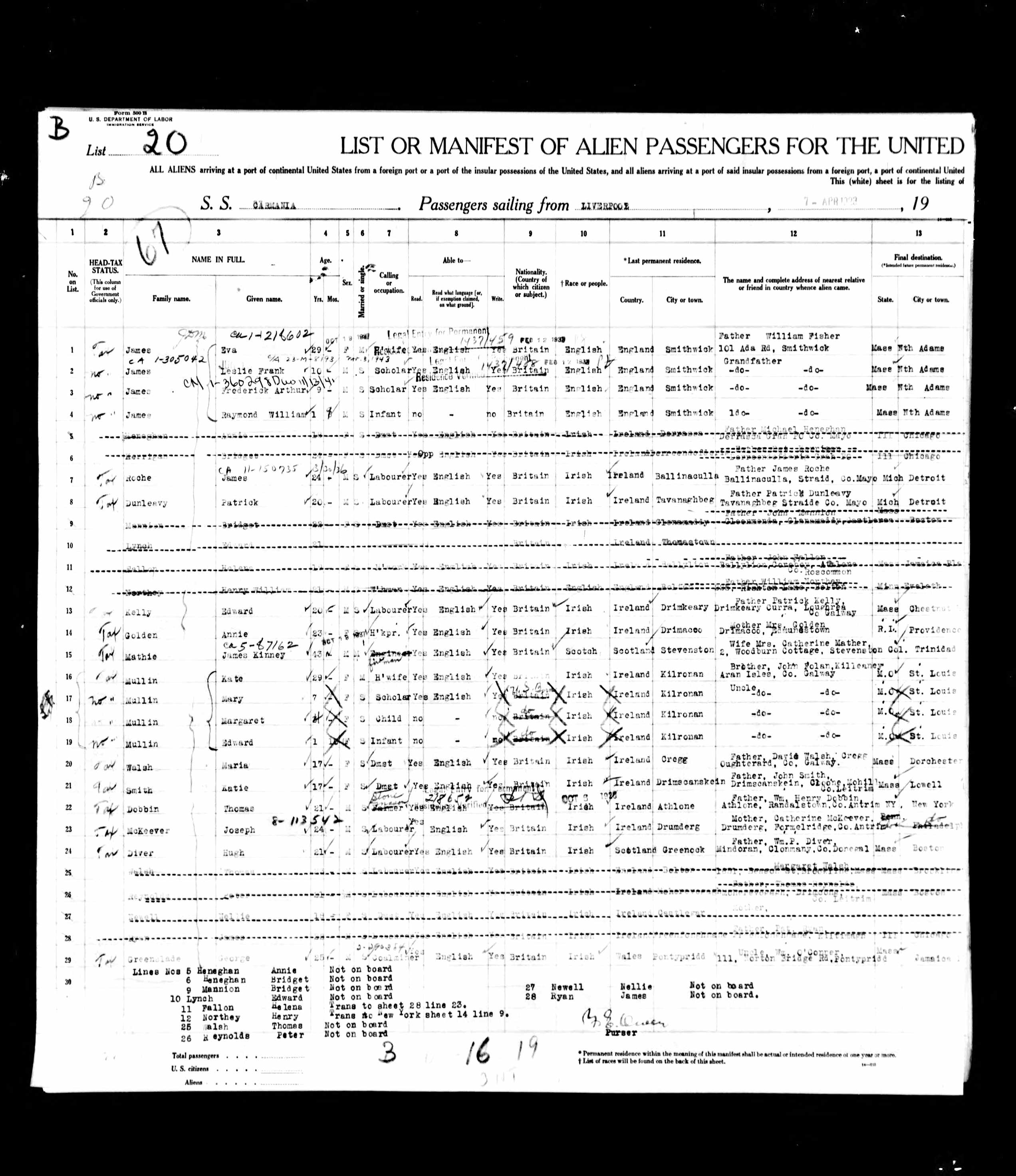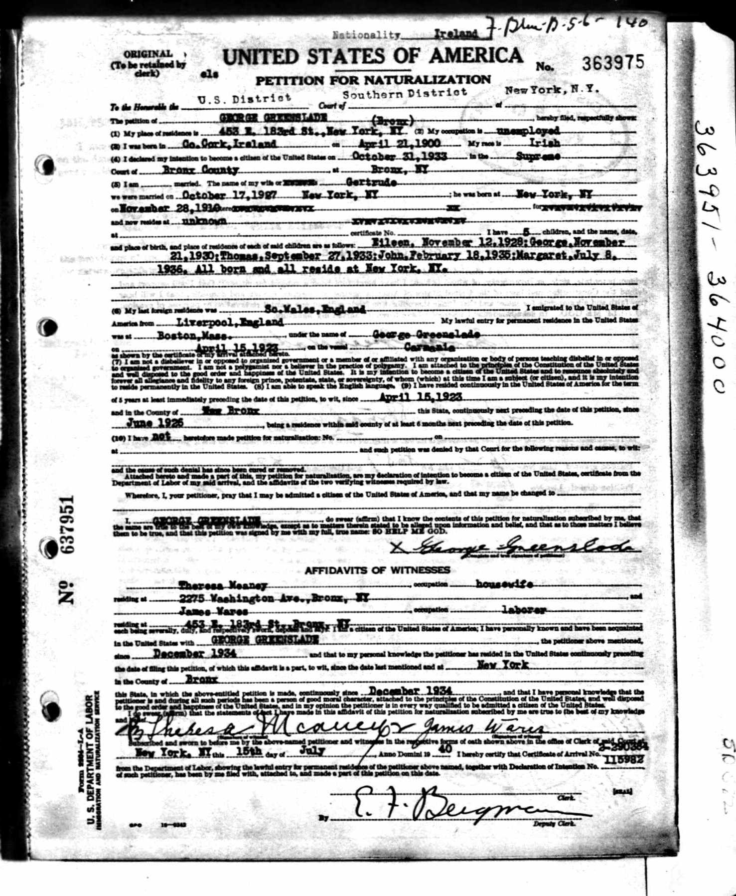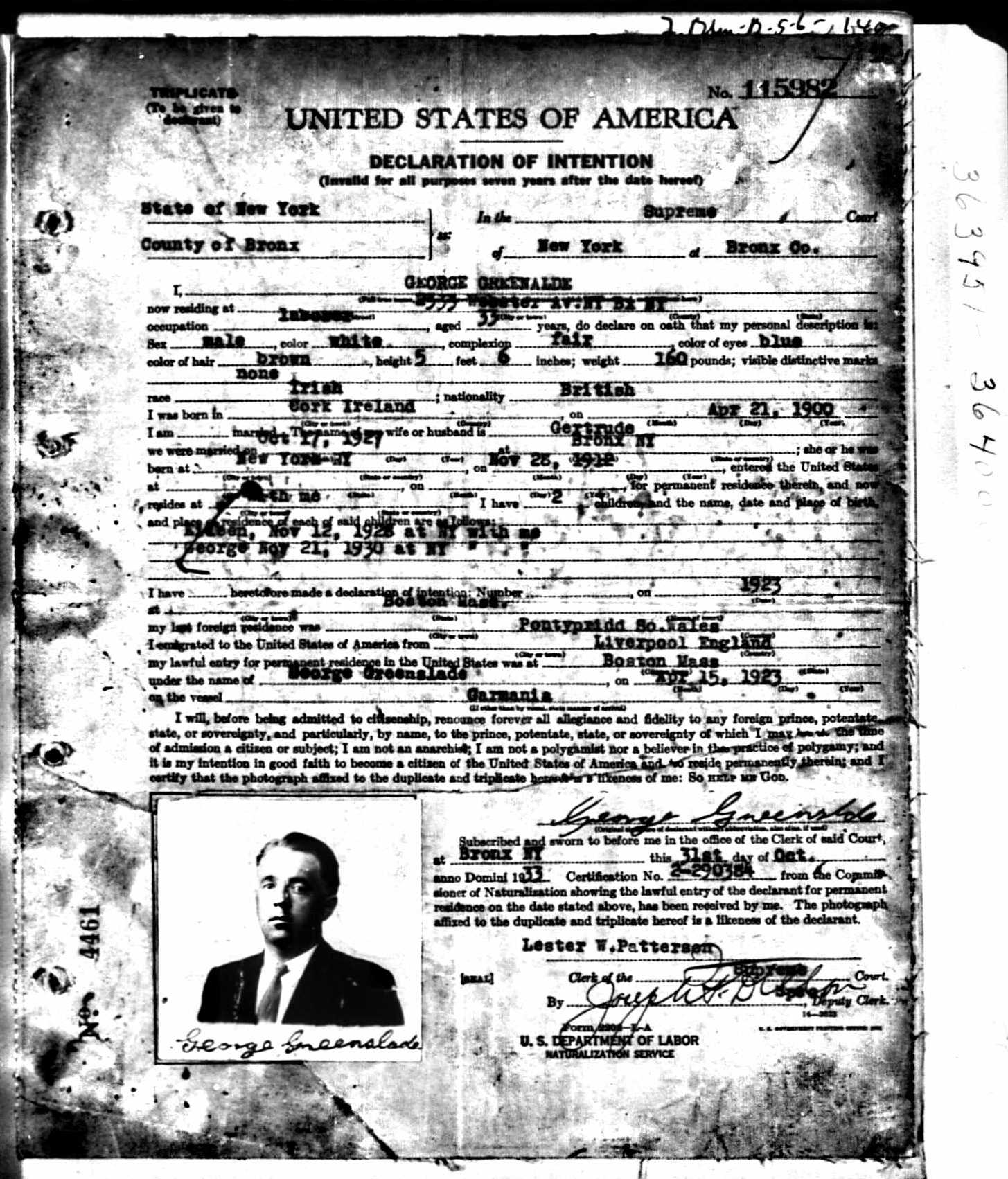 The 1911 Irish Census shows George as age 17, born in Waterford, a "man servant" for James Pumphry at house 9 in Ballynatray Commons (Templemichael, Waterford) [note name is given as George Greenslate]. George emigrated to Boston in 1923. He arrived in the port of Boston on April 15, 1923 aboard the ship Carmania sailing from Liverpool. See ship arrival record (line 29) page1 and page2. George is listed as single, age 25, dark complexion, dark hair, blue eyes. He is shown as coming from Pontypridd, Wales where he was a coalminer. He lists his closest relative in the country of departure as his uncle, William O'Conner, 111 Norton Bridge Rd, Pontypridd. He is travelling to join his cousin, Robert Welch, 58 Chestnut Ave, Jamaica Plain, Boston, Mass. [Who is George's uncle, William O'conner, in Pontypridd? Possibly the husband of a sister of one of George's parents. When the UK 1921 Census is made available in 2022 it may have good information. There is a vaguely possible Wm O'Connor in the 1911 Wales Census at Llanhilleth, Monmouthshire (30 miles from Pontypridd), who is age 33, married to an Ellen, age 41 (born in Wales) and they have a 14 year old daughter, Hannah. William is listed as a collier, orginally from Waford, Ireland (presumably Waterford). There are messages on the Internet from the daughter of a Thomas Fehily who, she said, went with Wm O'Connor from Waterford to Wales in 1921. "My father Thomas Fehily left Coolbeggan, Co. Waterford on 10 Jan 1921 with a Will Conners for Pontypridd, Wales. Next I found him in NYC, USA during 1926/1927. He only said that he worked in the mines." This is the same Wm O'Conner as she says that William and Thomas were living at 111 Norton Bridge Rd. Also, Thomas Fehily (age 23) and a Peter O'Connor (age 27), both listed Wm O'Connor at the Norton Bridge address as their closest friend in Wales, and both travelled on the same ship with George Greenslade to Boston in April 1923.] [Who is George's cousin, Robert Welch, in Boston? A possibility is found in Boston marriage records for 1860 which records the marriage of Ellen Leahy (b abt 1835 in Ireland, with father, David, and mother (oddly), Edward) to William Welch (b abt 1828 in Ireland). There is an immigration record for an Ellen Leahy, age 18, arriving in Boston on Nov. 20, 1854 which might be this Ellen. She could possibly be the sister of Maurice Leahy (father of Margaret Leahy (George's mother)).] The 1930 U.S. Census gives his age as 29, 26 when first married, he was born in Ireland, his father in England and his mother in Northern Ireland, he emigrated to the U.S. in 1923, he's a chauffeur in the "heating concern" industry (see record) The 1940 U.S. Census: George Greenslade, head, age 41, married, educated through 8th grade, born in the Irish Free State, a handyman in the stone supply industry; and his children, Eileen, age 11, born New York; George age 9, born New York; Thomas age 6, born New York; John age 5, born New York. In 1933 George began naturalization proceedings with a declaration of intent and completed the process in 1940 with a petition for naturalization. Note that George gives his birth date as April 21, 1900, which cannot be correct as it conflicts with the baptismal date of March 25, 1894, and with the 1901 Irish Census which gives his age then as 7. The 1933 declaration says that he is a laboror, age 33, with fair complexion, brown hair, blue eyes, 5'6'', 160 lbs. The 1940 petition gives his address as 453 E. 183rd St, New York, NY. He has lived in the Bronx since June 1926. George was killed crossing a street in New York. | ||