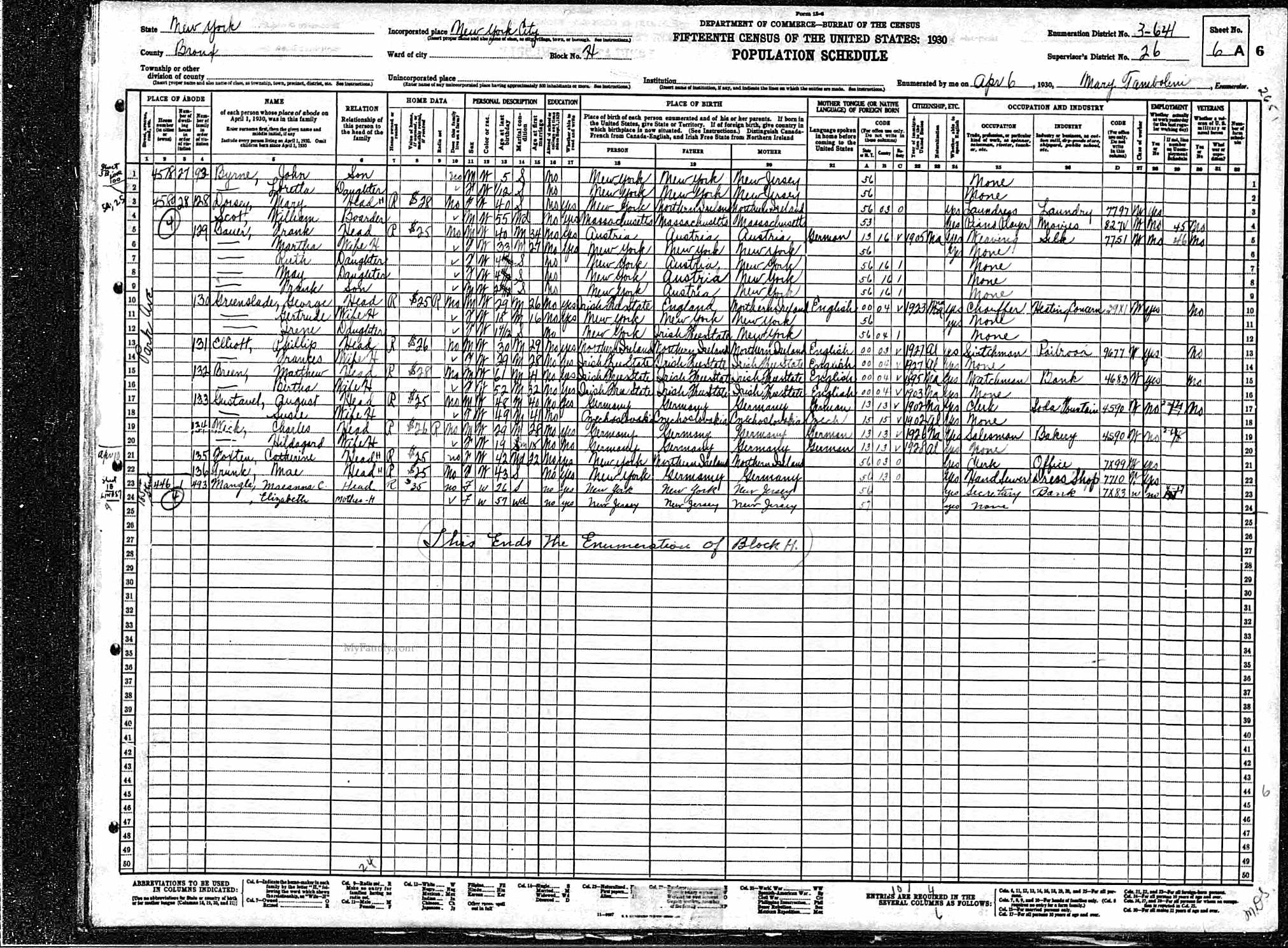 The 1930 U.S. Census gives her age as 18, 16 when first married, she was born in New York, as were her parents (see record) The 1940 U.S. Census shows the family without Gertrude. George is listed as married and not widowed. The family story is that Gertrude abandoned the family (in approx. Jan 1937) (and that what happened to her is unknown), which is confirmed by George's July 1940 Petition for Naturalization which gives Gertrude's residence as "unknown". | ||