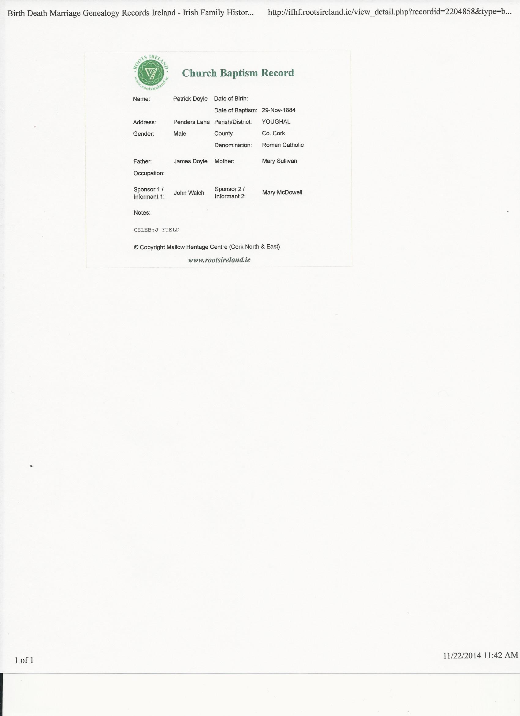 | Baptised | Youghal (Patrick Doyle, Date of Baptism: 29-Nov-1884, Address: Penders Lane, Parish: Youghal, Father: James Doyle, Mother: Mary Sullivan, Sponsors: John Walch and Mary McDowell. See record) [Note that the civil registration record is 'Bartholomew' and the church baptismal record is 'Patrick']) | |