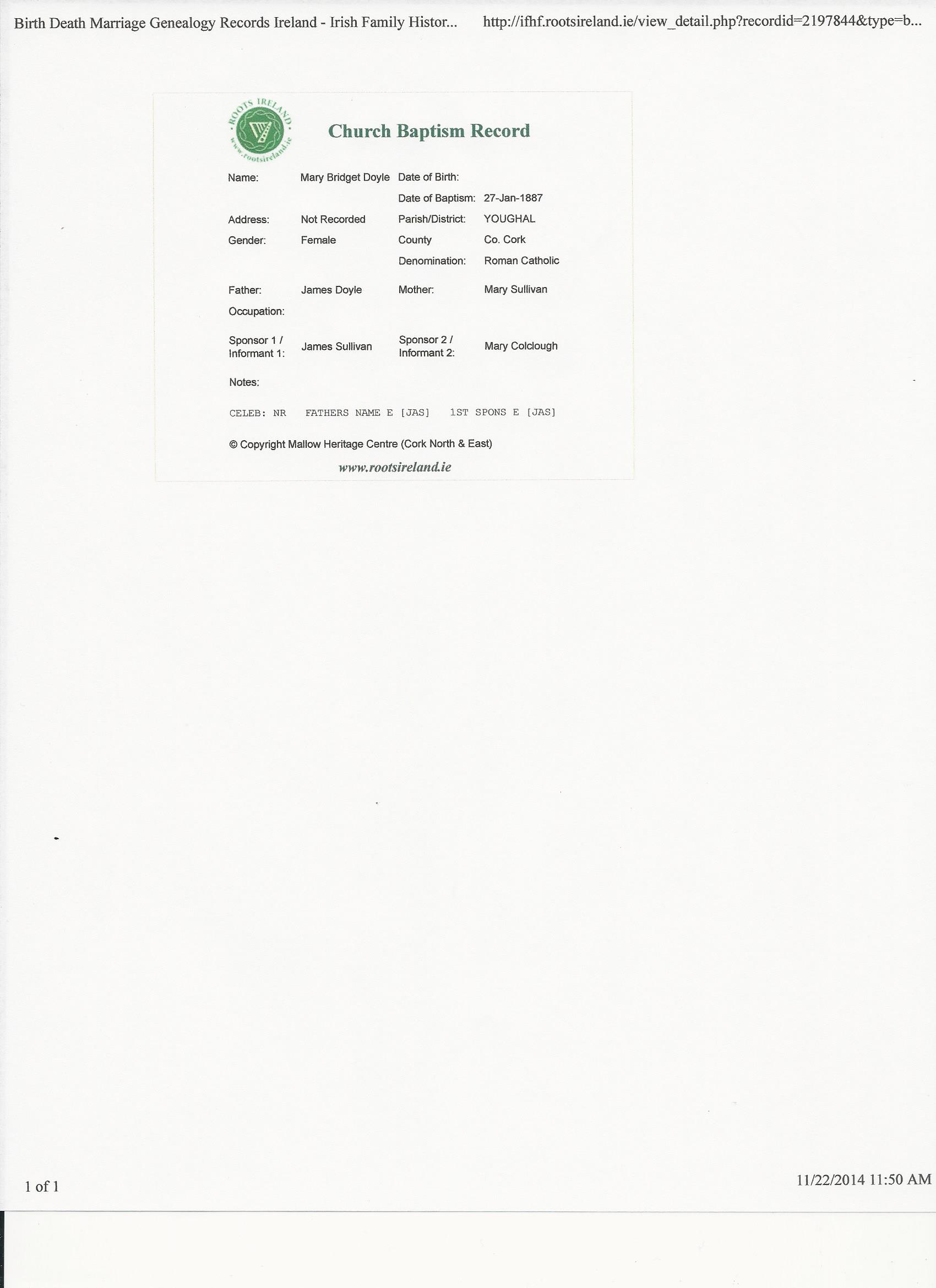 | Baptised | January 23 1887 | Youghal (Mary Bridget Doyle, Date of Baptism: 27-Jan-1887, Parish: Youghal, Father: James Doyle, Mother: Mary Sullivan, Sponsors: James Sullivan and Mary Colclough) See record |
