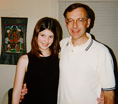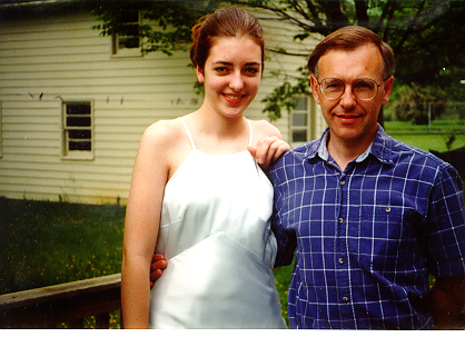 | picture | Greta in her prom dress (May 1998), and her dad on the back deck of the Alum Springs Rd house. |
