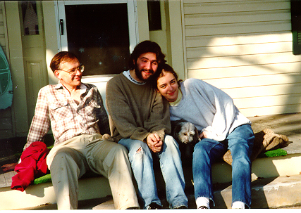 | picture | John, Gavin, Greta, and Veronica's dog Sophie in late 1996, on the front steps of the Alum Springs house. |