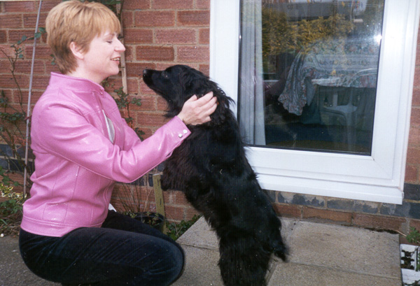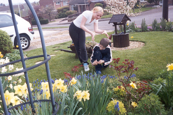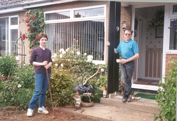 Spring 2000, in Jo's front garden. Sally's Chris and Isobel's Kitty.