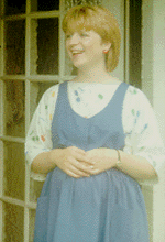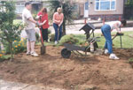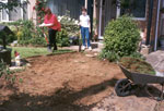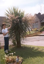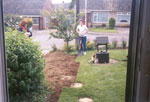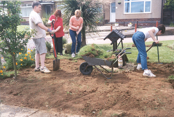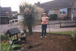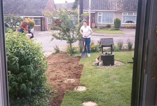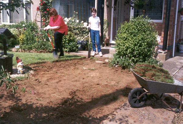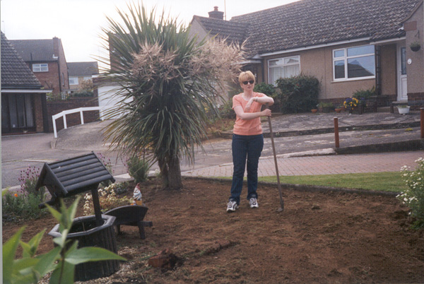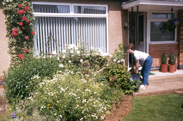 Summer 2000. Siobhan in Jo's garden. This and the following pictures are a series showing the progress in removing the grass from Jo's front garden and replacing it with gravel.